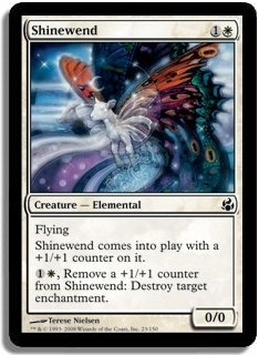 Flying Shinewend comes into play with a +1/+1 counter on it. 1W, Remove a +1/+1 counter from Shinewend: Destroy target enchantment.
