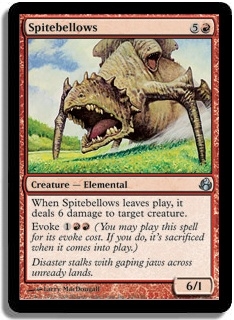 When Spitebellows leaves play, it deals 6 damage to target creature. Evoke 1RR (You may play this spell for its evoke cost. If you do, it's sacrificed when it comes into play.)