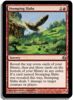 Reveal the top seven cards of your library, then put those cards on the bottom of your library in any order. If a card named Stomping Slabs was revealed this way, Stomping Slabs deals 7 damage to target creature or player.