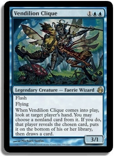 Flash Flying When Vendilion Clique comes into play, look at target player's hand. You may choose a nonland card from it. If you do, that player reveals the chosen card, puts it on the bottom of his or her library, then draws a card.