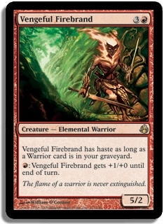 Vengeful Firebrand has haste as long as a Warrior card is in your graveyard. R: Vengeful Firebrand gets +1/+0 until end of turn.
