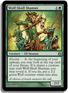 Kinship - At the beginning of your upkeep, you may look at the top card of your library. If it shares a creature type with Wolf-Skull Shaman, you may reveal it. If you do, put a 2/2 green Wolf creature token into play.