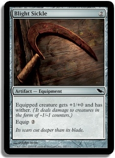Equipped creature gets +1/+0 and has wither. (It deals damage to creatures in the form of -1/-1 counters.) Equip 2