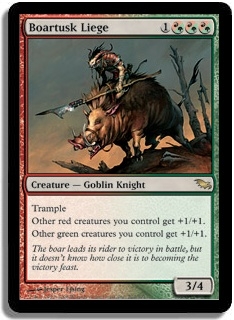 Trample Other red creatures you control get +1/+1. Other green creatures you control get +1/+1.