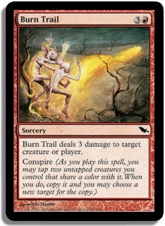 Burn Trail deals 3 damage to target creature or player. Conspire (As you play this spell, you may tap two untapped creatures you control that share a color with it. When you do, copy it and you may choose a new target for the copy.)