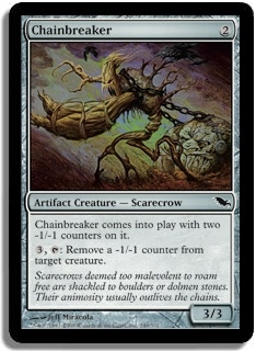 Chainbreaker comes into play with two -1/-1 counters on it. 3, T Remove a -1/-1 counter from target creature.