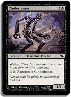 Wither (This deals damage to creatures in the form of -1/-1 counters.) 1B: Regenerate Cinderbones.