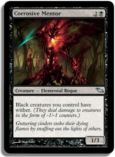 Black creatures you control have wither. (They deal damage to creatures in the form of -1/-1 counters.)
