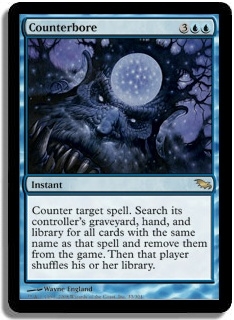 Counter target spell. Search its controller's graveyard, hand, and library for all cards with the same name as that spell and remove them from the game. Then that player shuffles his or her library.