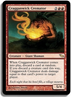 When Cragganwick Cremator comes into play, discard a card at random. If you discard a creature card this way, Cragganwick Cremator deals damage equal to that card's power to target player.