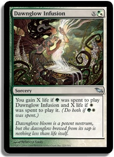 You gain X life if G was spent to play Dawnglow Infusion and X life if W was spent to play it. (Do both if GW was spent.)