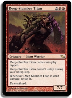 Deep-Slumber Titan comes into play tapped. Deep-Slumber Titan doesn't untap during your untap step. Whenever Deep-Slumber Titan is dealt damage, untap it.