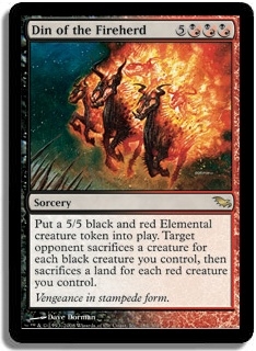Put a 5/5 black and red Elemental creature token into play. Target opponent sacrifices a creature for each black creature you control, then sacrifices a land for each red creature you control.