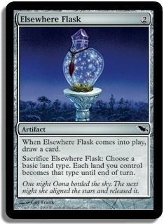 When Elsewhere Flask comes into play, draw a card. Sacrifice Elsewhere Flask: Choose a basic land type. Each land you control becomes that type until end of turn.