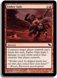 Creatures target player controls can't block this turn. Ember Gale deals 1 damage to each white and/or blue creature that player controls.