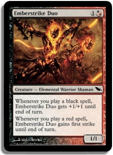 Whenever you play a black spell, Emberstrike Duo gets +1/+1 until end of turn. Whenever you play a red spell, Emberstrike Duo gains first strike until end of turn.