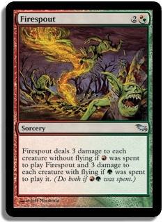 Firespout deals 3 damage to each creature without flying if R was spent to play Firespout and 3 damage to each creature with flying if G was spent to play it. (Do both if RG was spent.)