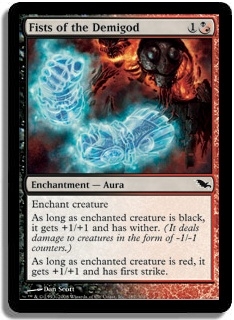 Enchant creature As long as enchanted creature is black, it gets +1/+1 and has wither. (It deals damage to creatures in the form of -1/-1 counters.) As long as enchanted creature is red, it gets +1/+1 and has first strike.