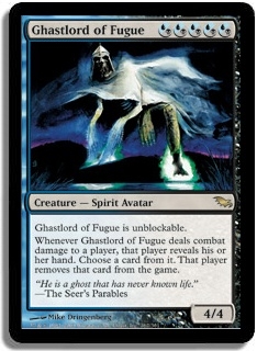 Ghastlord of Fugue is unblockable. Whenever Ghastlord of Fugue deals combat damage to a player, that player reveals his or her hand. Choose a card from it. That player removes that card from the game.
