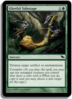 Destroy target artifact or enchantment. Conspire (As you play this spell, you may tap two untapped creatures you control that share a color with it. When you do, copy it and you may choose a new target for the copy.)