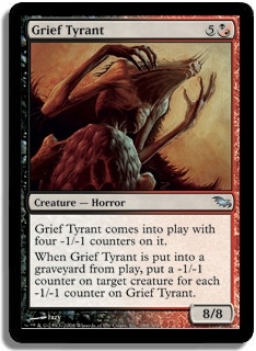 Grief Tyrant comes into play with four -1/-1 counters on it. When Grief Tyrant is put into a graveyard from play, put a -1/-1 counter on target creature for each -1/-1 counter on Grief Tyrant.