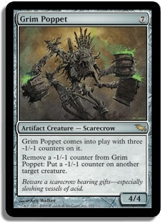 Grim Poppet comes into play with three -1/-1 counters on it. Remove a -1/-1 counter from Grim Poppet: Put a -1/-1 counter on another target creature.