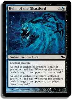 Enchant creature As long as enchanted creature is blue, it gets +1/+1 and has "Whenever this creature deals damage to an opponent, draw a card." As long as enchanted creature is black, it gets +1/+1 and has "Whenever this creature deals damage to an opponent, that player discards a card."