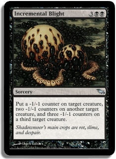 Put a -1/-1 counter on target creature, two -1/-1 counters on another target creature, and three -1/-1 counters on a third target creature.