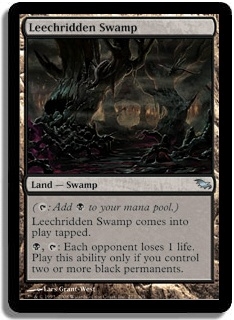 (T Add B to your mana pool.) Leechridden Swamp comes into play tapped. B, T Each opponent loses 1 life. Play this ability only if you control two or more black permanents.