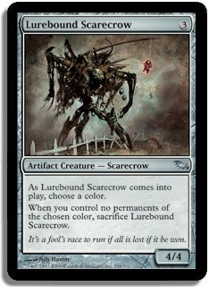As Lurebound Scarecrow comes into play, choose a color. When you control no permanents of the chosen color, sacrifice Lurebound Scarecrow.