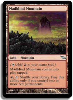 (T Add R to your mana pool.) Madblind Mountain comes into play tapped. R, T Shuffle your library. Play this ability only if you control two or more red permanents.