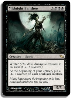Wither (This deals damage to creatures in the form of -1/-1 counters.) At the beginning of your upkeep, put a -1/-1 counter on each nonblack creature.
