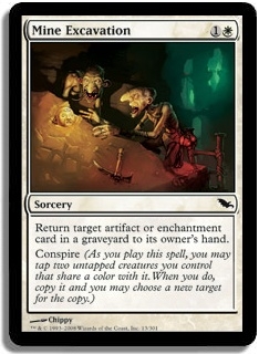 Return target artifact or enchantment card in a graveyard to its owner's hand. Conspire (As you play this spell, you may tap two untapped creatures you control that share a color with it. When you do, copy it and you may choose a new target for the copy.)