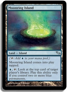 (T Add U to your mana pool.) Moonring Island comes into play tapped. U, T Look at the top card of target player's library. Play this ability only if you control two or more blue permanents.