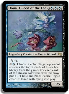 Flying Xo(u/b): Choose a color. Target opponent removes the top X cards of his or her library from the game. For each card of the chosen color removed this way, put a 1/1 blue and black Faerie Rogue creature token with flying into play.