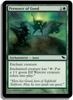 Enchant creature Enchanted creature has "T Put a 1/1 green Elf Warrior creature token into play."