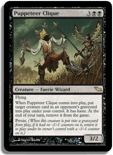 Flying When Puppeteer Clique comes into play, put target creature card in an opponent's graveyard into play under your control. It has haste. At the end of your turn, remove it from the game. Persist (When this creature is put into a graveyard from play, if it had no -1/-1 counters on it, return it to play under its owner's control with a -1/-1 counter on it.)