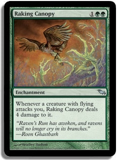 Whenever a creature with flying attacks you, Raking Canopy deals 4 damage to it.