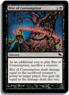 As an additional cost to play Rite of Consumption, sacrifice a creature. Rite of Consumption deals damage equal to the sacrificed creature's power to target player. You gain life equal to the damage dealt this way.