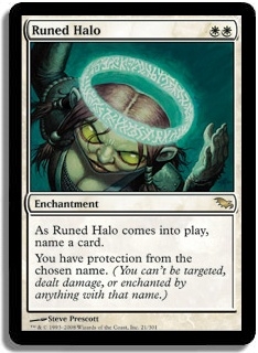 As Runed Halo comes into play, name a card. You have protection from the chosen name. (You can't be targeted, dealt damage, or enchanted by anything with that name.)