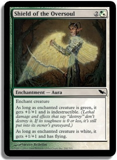 Enchant creature As long as enchanted creature is green, it gets +1/+1 and is indestructible. (Lethal damage and effects that say "destroy" don't destroy it. If its toughness is 0 or less, it's still put into its owner's graveyard.) As long as enchanted creature is white, it gets +1/+1 and has flying.