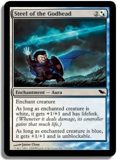 Enchant creature As long as enchanted creature is white, it gets +1/+1 and has lifelink. (Whenever it deals damage, its controller gains that much life.) As long as enchanted creature is blue, it gets +1/+1 and is unblockable.