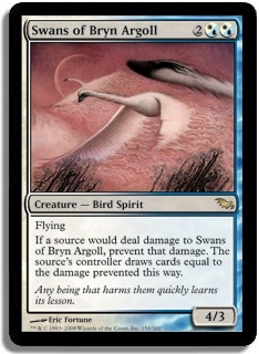 Flying If a source would deal damage to Swans of Bryn Argoll, prevent that damage. The source's controller draws cards equal to the damage prevented this way.