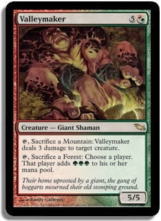 T, Sacrifice a Mountain: Valleymaker deals 3 damage to target creature. T, Sacrifice a Forest: Choose a player. That player adds GGG to his or her mana pool.