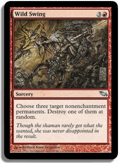 Choose three target nonenchantment permanents. Destroy one of them at random.