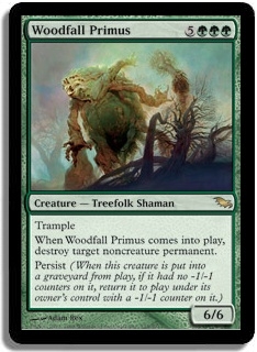 Trample When Woodfall Primus comes into play, destroy target noncreature permanent. Persist (When this creature is put into a graveyard from play, if it had no -1/-1 counters on it, return it to play under its owner's control with a -1/-1 counter on it.)