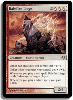 Other red creatures you control get +1/+1. Other white creatures you control get +1/+1. Whenever you play a red spell, Balefire Liege deals 3 damage to target player. Whenever you play a white spell, you gain 3 life.