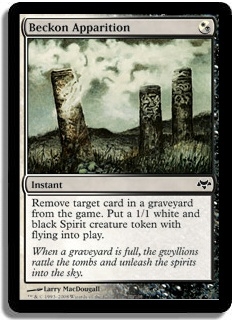 Remove target card in a graveyard from the game. Put a 1/1 white and black Spirit creature token with flying into play.