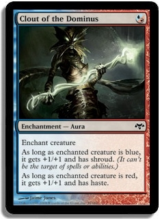 Enchant creature As long as enchanted creature is blue, it gets +1/+1 and has shroud. (It can't be the target of spells or abilities.) As long as enchanted creature is red, it gets +1/+1 and has haste.
