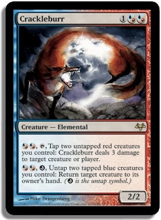 o(u/r)o(u/r), T, Tap two untapped red creatures you control: Crackleburr deals 3 damage to target creature or player. o(u/r)o(u/r), oQ, Untap two tapped blue creatures you control: Return target creature to its owner's hand. (oQ is the untap symbol.)